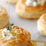 - Finish and Garnish: Remove the baking sheet from the oven and allow the pastry bites to cool for 2 minutes. Drizzle each piece with honey and garnish with a pinch of finely chopped fresh thyme leaves. Serve warm and enjoy!